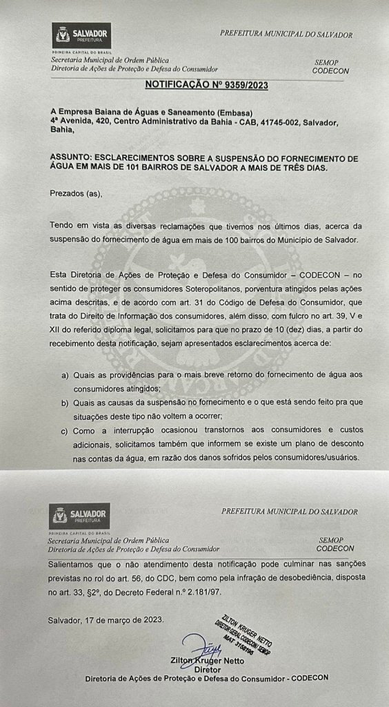 A Diretoria de Ações de Proteção e Defesa do Consumidor (Codecon), vinculada à Secretaria Municipal de Ordem Pública (SEMOP), notificou nesta sexta-feira (17) a Empresa Baiana de Águas e Saneamento (Embasa) pela suspensão do fornecimento de água, há mais de três dias, em mais de 101 bairros de Salvador.