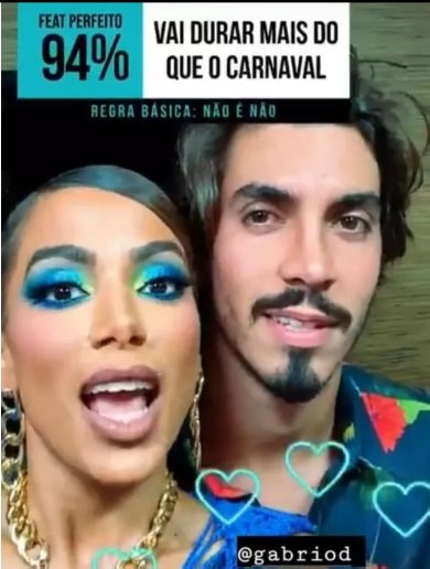 Anitta aproveitou o momento para posar ao lado de Gabriel David e até brincou com um filtro onde mostra a porcentagem de quanto o casal combina. No caso da dupla, o número alcançado foi de 94% e o app disse que eles vão 'durar mais que o Carnaval'.