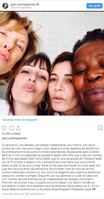A atitude empática da ex-global, que dispensou suas três empregadas, foi elogiada na web. No texto, Gabi conta que sempre teve a ajuda das três mulheres, Belmira, Rita e Maria Odete, durante toda sua vida, mas que nunca é tarde para aprender a se cuidar sozinha.