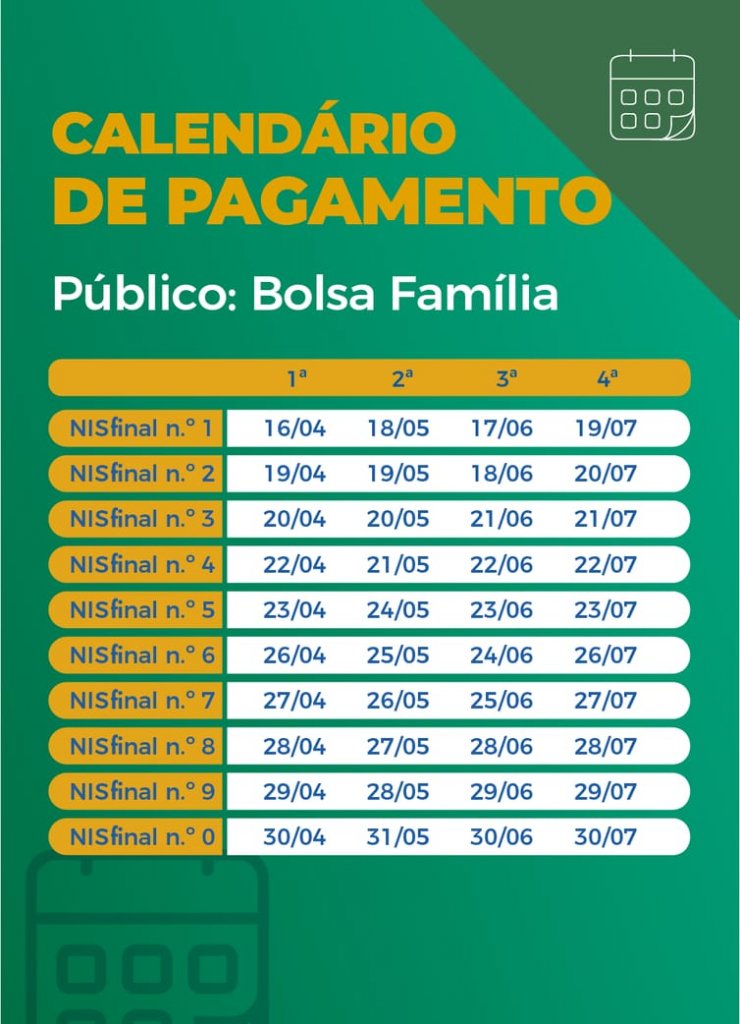 Para os beneficiários do Bolsa Família, o pagamento ocorre de forma distinta. Os inscritos podem sacar diretamente o dinheiro nos dez últimos dias úteis de cada mês, com base no dígito final do NIS.