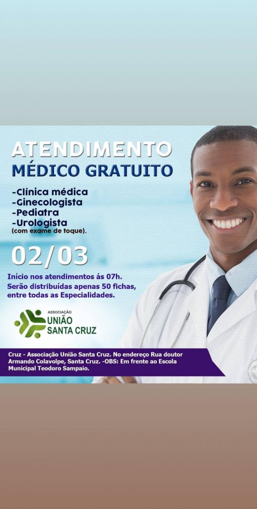 Associação União Santa Cruz que fica localizada na Rua Doutor Armando Colavolpe, no bairro de Santa Cruz oferece exames gratuitos para moradores, neste terça-feira (02/03), o atendimento médico gratuito será na Associação União